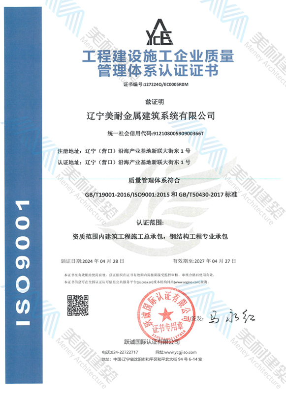 遼寧美耐金屬建筑系統(tǒng)有限公司位于遼寧(營口)沿海產業(yè)基地,專注于預制金屬建筑系統(tǒng)領域,是一家集工業(yè)建筑設計、制作、施工及相關的技術咨詢與服務為一體的綜合性服務企業(yè)。作為國家鋼結構協會會員、中國建筑金屬結構協會會員單位與國家高新技術企業(yè),美耐建筑集建筑工程施工總承包、鋼結構工程專業(yè)承包等多種資質于一身,并擁有22項鋼結構建筑領域專利,9項軟件著作權。